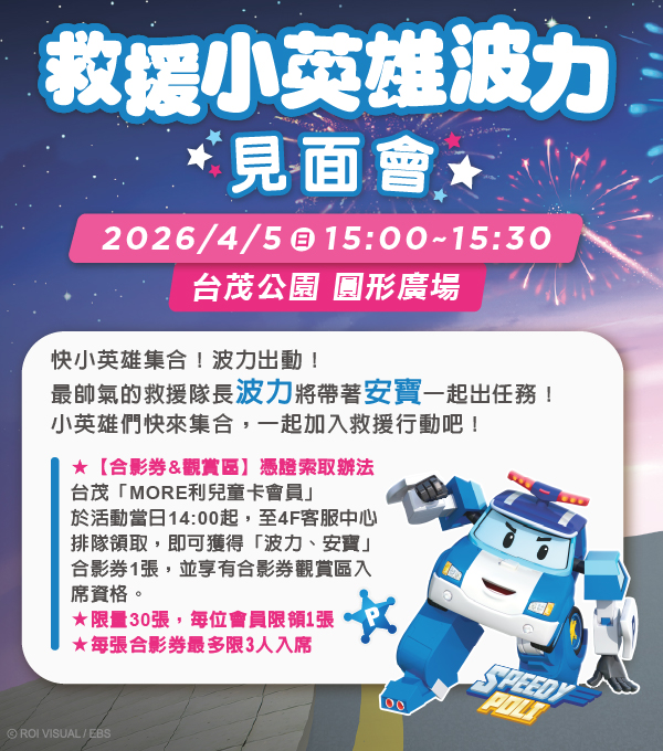 台茂「MORE利兒童卡會員」於活動當日14:00起,至4F客服中心排隊領取,即可獲得 「波力、安寶」合影券1張,並享有合影券觀賞區入席資格。