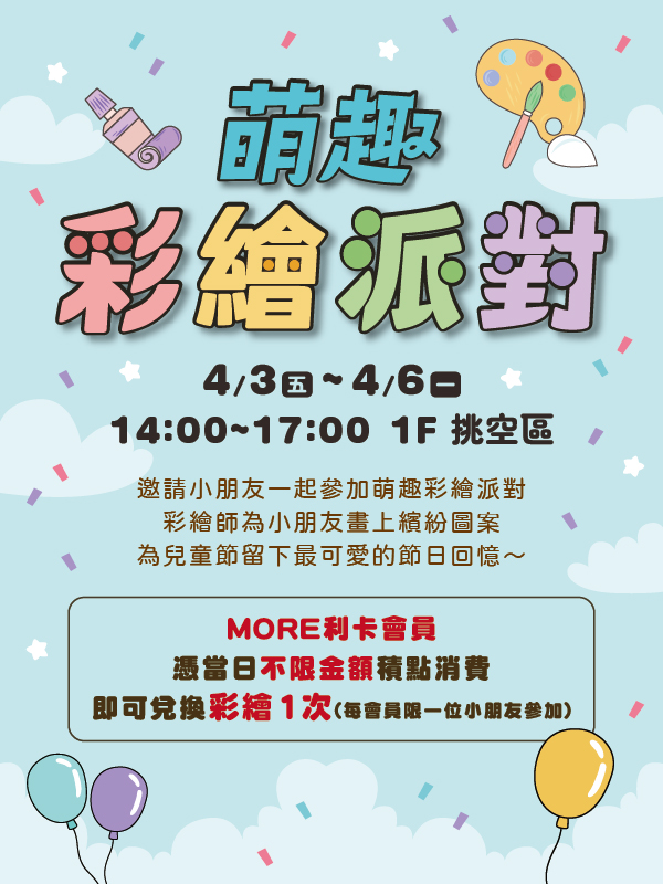 邀請小朋友一起參加萌趣彩繪派對,彩繪師為小朋友畫上繽紛圖案
